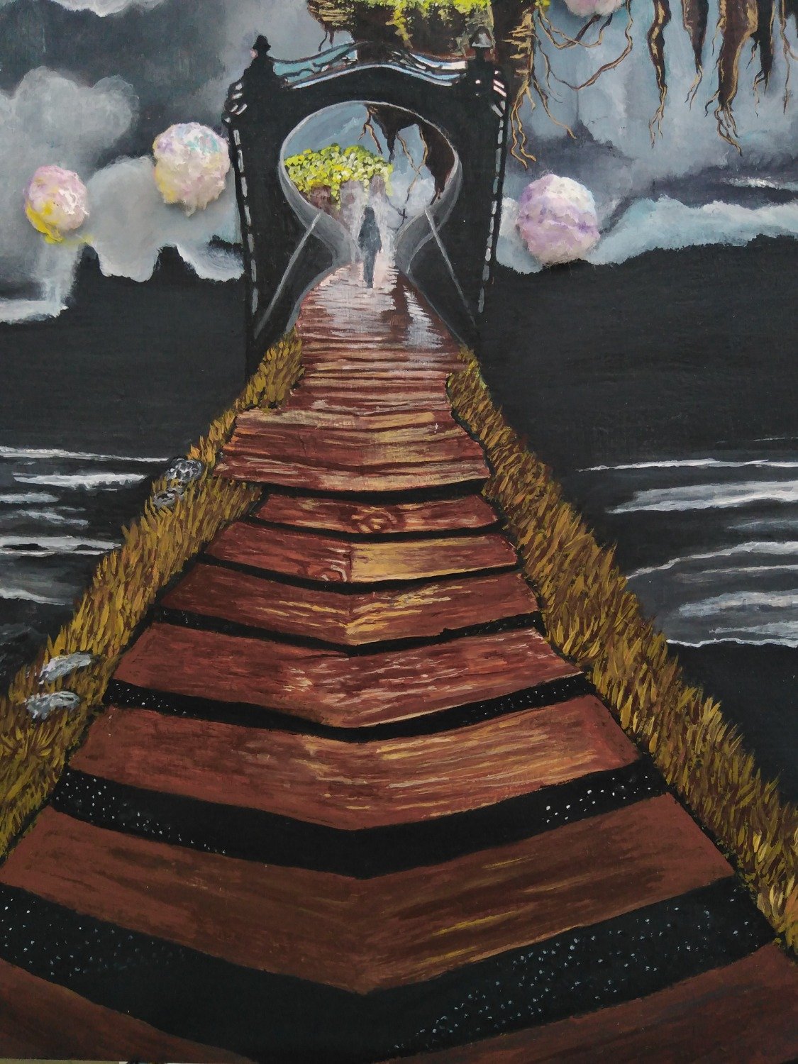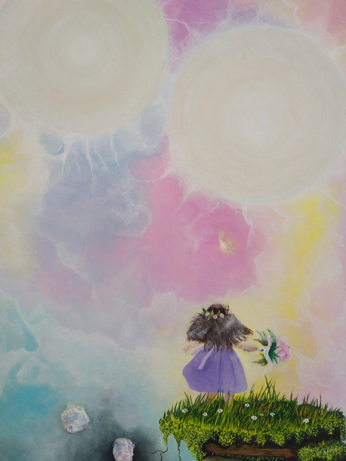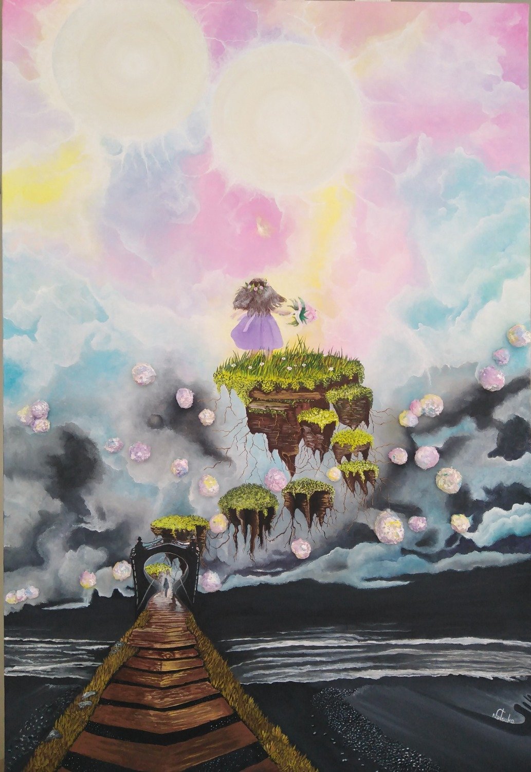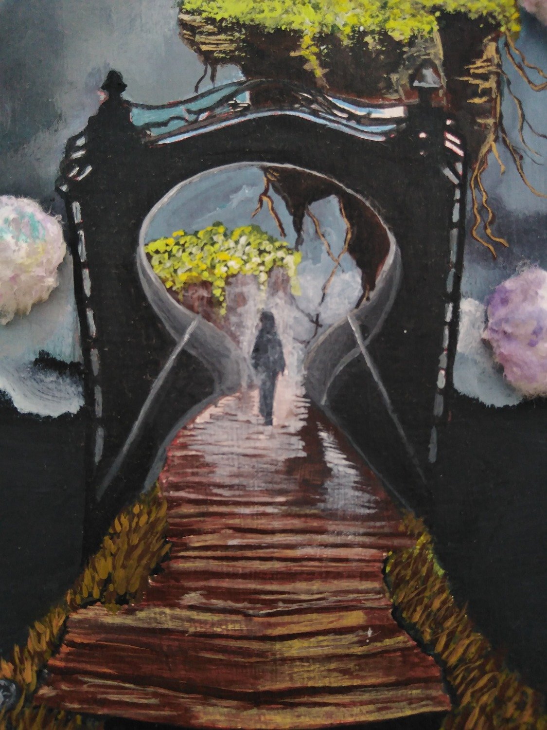 La composición destaca por el uso de texturas táctiles, incorporando algodón de colores apastelados para representar la suavidad de una nueva dimensión, una técnica inspirada en visiones onÃricas de la autora. El viaje culmina con la figura de una niña que, tras dejar atrás su forma adulta en el puente, recupera su esencia más pura. Guiada por dos esferas de luz radiante que emanan consuelo telepático, la protagonista abraza un nuevo comienzo, transformando el concepto tradicional de la muerte en un acto de alegrÃa, confianza y retorno a la inocencia.